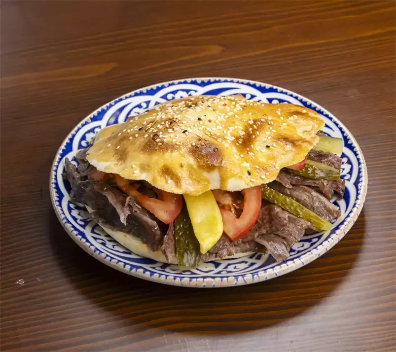 Döner, salatalık turşusu, domates ve patates lavaşa sarılıp fırınlanarak servis edilir.