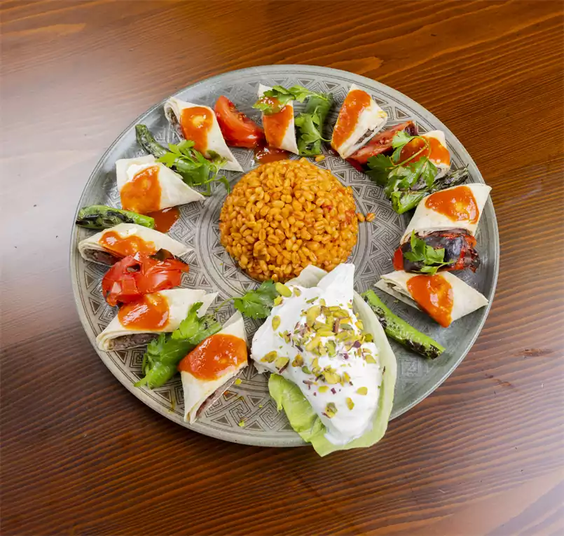 Zırh kıyma, köz domates, biber, bulgur pilavı ve sumaklı soğan ile servis edilir.