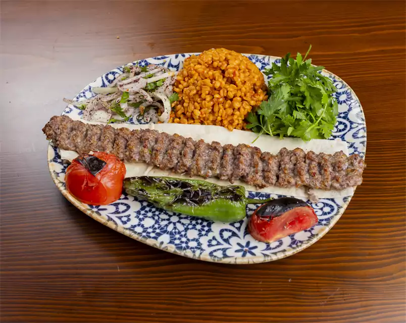 Özel baharatlanmış köftelik kıyma, köz biber, bulgur pilavı ve sumaklı soğan ile servis edilir.